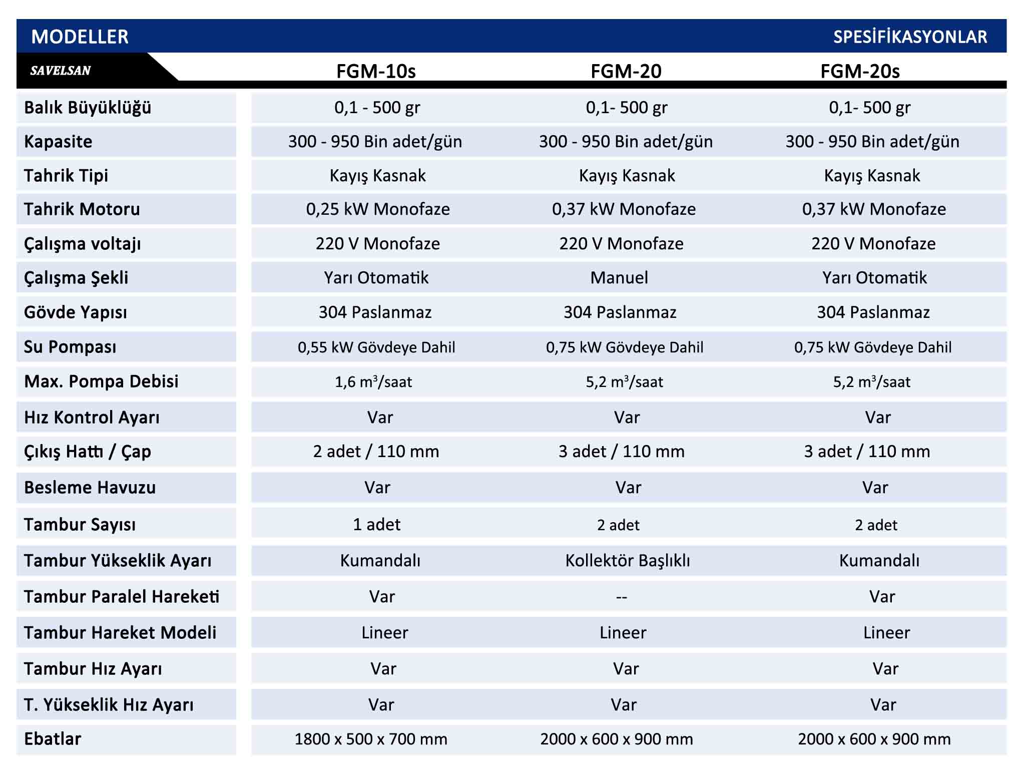 0,4 gr ile 500 gr arasında her türdeki balığın boylaması yapılmakta olup, kapasitesi balığın büyüklüğüne bağlı olmak şartıyla ortalama 300.000 - 1.000.000 adet/gün’ dür. 3 hatlı boylama yapılmaktadır. Her daim rakiplerinden farkındalık oluşturan makineler arasında bulunan Yarı Otomatik Balık Boylama Ünitesinde de, tamburların aralıkları Savelsan tarafından geliştirilen Z eksen Bataryalar ile çok daha hassas olup, yukarı-aşağı hareketleri paralel ya da tek tek yapabilme imkanı kılar. Ayrıca ölçü çakısı kullanımına gerek kalmadan aralık ölçüsünü bataryalar üstündeki cetvelden takip edilebilir ve haraketlendirmeleri kumandadan yapılır. 100 mikron hassasiyetine sahip olan ünite, balık boylamalarında kulllanım kolaylığı sağlar.